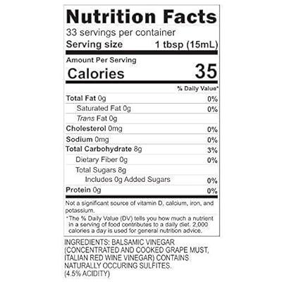 A condiment serving should contain no more than 1 gram of carbohydrate per serving. Do balsamic vinegars contain lead? The book the healing powers of vinegar discusses the effects of acetic acid, a key compound found in balsamic vinegar and other varieties. Williams sonoma) giuseppe giuste premio balsamic vinegar of modena ($6 for 500 ml; For someone to get lead poisoning she would have to drink 500 to 1,000 cups of vinegar a day. Amount of glucose in balsamic vinegar: How much protein is in balsamic vinegar? There are a minimum of 5 calories per teaspoon in balsamic vinegar according to the usda national nutrient database (1). A typical target for total estimated glycemic load is 100 or less per day. A person should limit their intake to about 2 tablespoons or less, as drinking too much can cause an upset stomach and other issues. The typical dosage for vinegar is usually one or two tablespoons per day. The production of commercial balsamic, however, is much faster, with many vinegar products ready after just a few months of aging. How long does balsamic vinegar last.